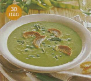 1. Trocea las hortalizas: Pela y pica la cebolla. Raspa la zanahoria y limpia el apio. Lava y corta en dados. Corta la panceta. Saltea la verdura y la panceta 5 min. en el aceite. Vierte el caldo, lleva a ebullición y cuece 15 min. Tuesta el pan. Cuece los guisantes en agua con sal 10 min. Escúrrelos, reserva 2 cucharadas y pasa el resto por el pasapurés.