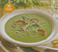 2. Agrega la nata: Agrega el puré de guisantes a la verdura y da un hervor, Añade la nata y los guisantes reservados, sazone y cuece, a fuego lento, 5 min. Sirve la crema decorada con el pan y la menta.